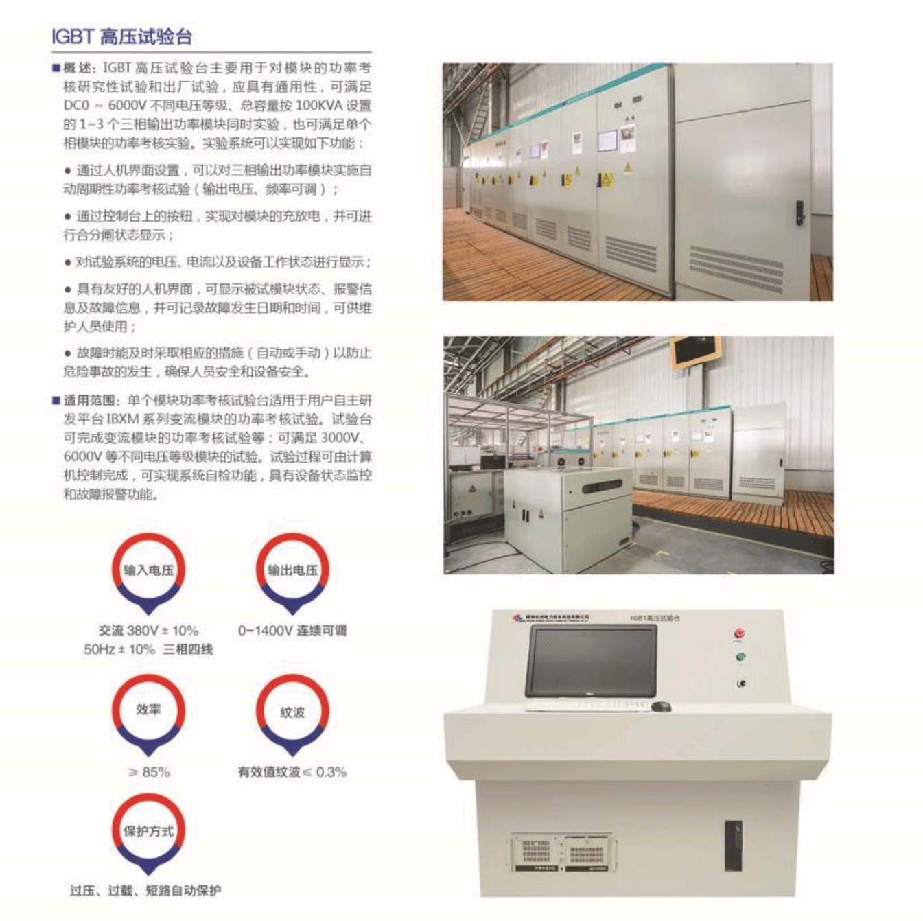 适用范围: 单个模块功率考核试验台适用于用户自主研发平台IBXM系列变流模块的功率考核试验。试验台可完成变流模块的功率考核试验等;可满足3000V、6000V等不同电压等级模块的试验。试验过程可由计算机控制完成,可实现系统自检功能,具有设备状态监控和故障报警功能。