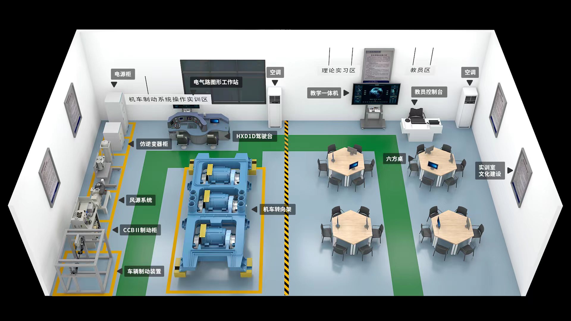 项目的主要设备配置包含1套驾驶台、1套CCBII制动柜、1台转向架、1个逆变器柜、1套风源系统、1套理论教学区设备、实训室基础设施建设(实训室隔墙及实训室文化建设)。整个项目的搭建以HXD1C型电力机车制动系统设备为原型,按照招标文件所配备的设备进行整合搭建。搭建完成后,项目所有的实体联动设备都按照真实HXD1C型CCBII制动系统进行通讯、信号给定及传输,能按照真实CCBII制动系统的故障进行故障模拟,学员可通过设置在驾驶台(右侧)的故障设置考核系统依照《静态试验协议/制动控制,轮对防滑保护和辅助装置》以及《CCBII制动系统维护手册》为参考进行设置实训项点,所有管路/电路硬故障的真实故障满足真实克诺尔CCBII制动系统故障控制逻辑。